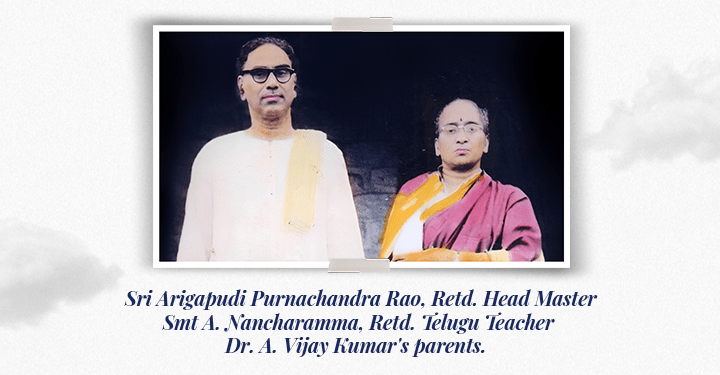 Lion Dr. Arigapudi Vijay Kumar is one of the rare people who personify their given names – He has seen Vijay (success) with every task he has undertaken in every field he has been associated with. Born in a family with high moral,ethical and philanthropic values to Sri Arigapudi Purnachandra Rao, Retd. Head Master and Smt. A.Nancharamma, Retd. Telugu Teacher, he grew up emulating his elders and learning the “Joy of giving”.