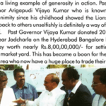 ← Back ఆ తర్వాత వైస్ డిస్ట్రబ్ గవర్నర్గా ఏకగ్రీవంగా ఎన్నికయి అనేక సేవా కార్యక్రమాలు చేపట్టారు. 1997-98 లో లయన్స్ క్లబ్ డిస్ట్రిక్ట్ గవర్నర్గా ప్రమాణస్వీకారం చేసిన దగ్గర నుండి పేద బలహీనవర్గాల వారికి మరింత సేవ చేసే భాగ్యం కలిగింది. ప్రతి మనిషి ఉన్నతంగా ఎదగాలంటే అతనికి తప్పకుండా పరోక్షంగా సమాజం సహకరించినట్లే అదే లేకపోతే మనిషి ఎదిగి ఉండేవాడు కాదు. అని రీజనింగ్ చెప్పే విజయ్ కుమార్ ఏ సమాజం ఉన్నతకి దోహదపడుతుందో దానిలో కొంత భాగాన్ని తీసి…